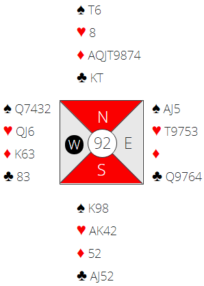 Begge deler kan fungere. Mange vil si at i ugunstig sone må man ha noe sånt for åpning på tre-trinnet 3 ruter, men jeg vedder på at de samme spillerne med så god syvkorts farge også åpner med 3 ruter selv om de mangler kløver konge. Problemet med å åpne med sperremelding med en litt vid "range" av håndtyper gjør det vanskelig for makkeren å vite hvor høyt de skal. Samtidig blir åpning med 1 ruter feil hvis det er motparten som har kortene, de får melde seg på og kommunisere på et lavt trinn. Det er nok slik at begge deler kan være riktig, men begge deler kan også bli feil. De fleste åpnet antagelig med 3 ruter. Uansett var kortene plassering av stor betydning hvor høyt N/S kunne tåle å melde. Slik så hele spillet ut: