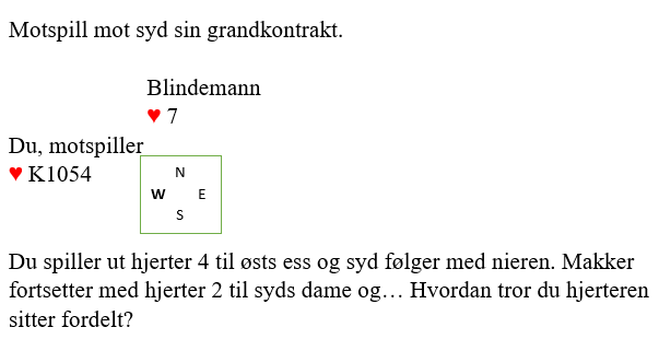 Fargelengden er altså klar, syd har fire hjerter. Den informasjonen må i dette tilfellet kombineres med å ta syds plass et øyeblikk, og se for seg hva han kan, eller vil gjøre i første stikk med forskjellige hjerterkombinasjoner. Han la altså nieren i stikk en. Ville han gjort det med Q-J-9-3 eller Q-J-9-6 som er to muligheter?