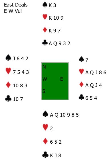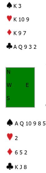 Etter østs åpning 1 hjerter klarte N/S å komme seg i den gode utgangen 4 spar. Vest passet hele meldingsforløpet, og øst meldte ikke mer enn åpningsmeldingen 1 hjerter.