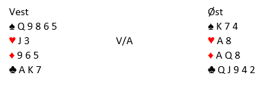 Hvis nord startet med fire spar satt han opprinnelig med AJ103, og nå sitter han i så fall igjen med A-10-3. Vest spilte spar mot bordet og nord fulgte med spar 3. Det er to muligheter: