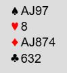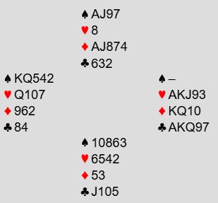 Pierre Zimmermann trodde tydeligvis han skulle få stikk for begge essene. For etter at Helgemo sine lagkamerater Grue-Moss hadde meldt seg opp i 6 hjerter doblet han. Øst hadde åpnet med sterk kunstig 1 kløver og senere vist hjerterfarge. Men de to essene ga ikke to stikk denne gangen!