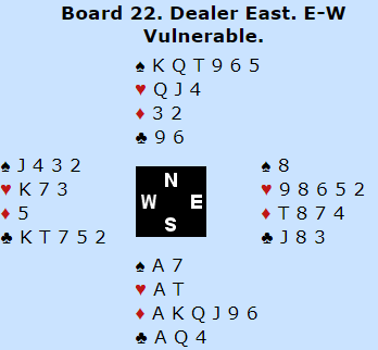 De norske veteranene var i lilleslem i ruter og fikk gevinstspill da motstanderlaget gikk bet i 7NT. I den klassen var det fem som meldte og vant storeslem i grand eller ruter, og fem andre gikk bet i enten 7 ruter, spar eller grand.