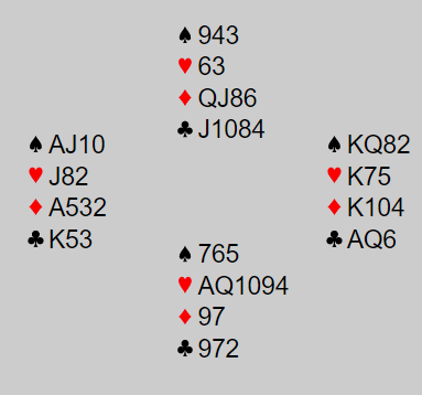 Ann Bi (vest) åpnet med 1 kløver, og Ingunn svarte 1 hjerter som var overføring, 4+ spar. Syd doblet, og doblingen ble forklart som hjreterfarge. Vest redoblet, og det betyr trekorts spar. Det gikk to passer til Ingunn etter denne starten: