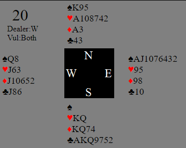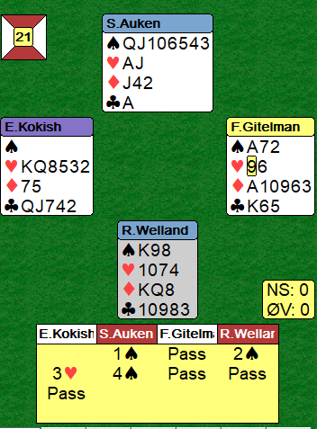 Auken fant en god spilleplan som jeg mistenker ble kopiert der Norge spilte 6 spar (Norge-Beijing ble ikke overført på BBO). Hun vant med stor hjerter, tok ut trumfen og da den satt 2-2 spilte på eliminasjon og innspill. To store kløver ble spilt, så kløver til trumf fulgt av hjerter til den andre honnøren og mer hjerter. Uansett hvem som kommer inn (her vest) står da kontrakten om ruterhonnørene sitter fordelt siden forsvaret må åpne ruteren eller spille til dobbeltrenons. Men her satt Q-J i ruter på samme side, og da var det ikke til å unngå en rutertaper og en bet i slemmen.