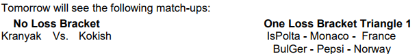 I "No Loss Bracket" var lagene som var fra nr. 1-8 i kvalifiseringen, og de to som fortsatt er der har ikke tapt en kamp i sluttspillet. Det laget som vinner kampen mellom Kranyak og Kokish er klar for finalen. Taperen av den kampen har da fortsatt ett "liv" og vil spille om finaleplass mot de to vinnerne fra de to tre-lags kampene i "One Loss Bracket".