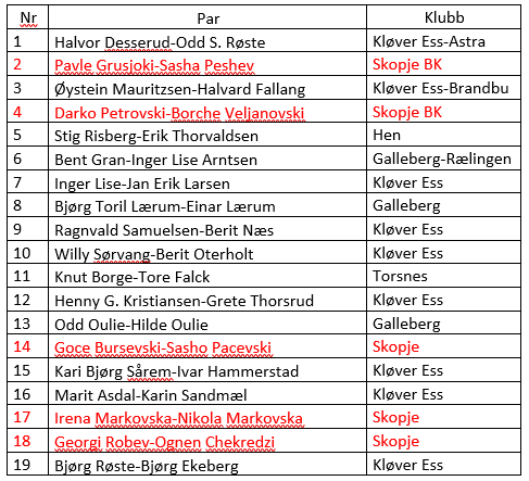 Dette var tiende året på rad at BK Kløver Ess arrangerte bridgeturnering i Syden, denne gangen var vi 31 reisende, 28 kortspillere og 3 kortbrukere. Etter en litt trøblete start ble resten av den fem dager lange turneringen rodd greit i land, blant annet takket være de to flinke turneringsledere Halvard Fallang og Einar Lærum. De lokale parene bød på god motstand selv om det ble et norsk par som gikk av med seieren. Resultatlisten ble seenede slik ut: