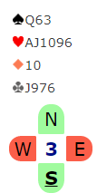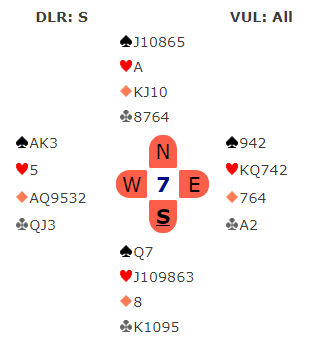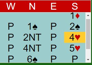 Nå viste hoppet til 4 hjerter kortfarge, men jeg vil tro det også lover fire-korts trumf uten at jeg er helt sikker på avtalene deres. Ok, hun manglet en trumf, men tenkte vel at det kompenserer en del at kortfargen ikke bare er en singelton, men renons. Og honnørene ellers er det all grunn til å like. Uansett, det må vel være lov å si at dette var temmelig tøffe tak?