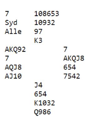 Hvis vest velger åpne med 2 kløver ender de antagelig i slem, og da er 6NT beste sjanse. Det er litt i hardeste laget med slem. Selv om ruterfinessen går og hjerteren gir full uttelling blir det vanskelig å vinne tolv stikk. Problemet er å komme seg over til østs hånd for å få tatt to ruterfinesser. Det er bare ett inntak til øst...