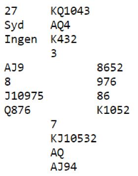 N/S vinner ganske enkelt 6 hjerter. Det er en glimrende slem selv om den ikke er helt sikker hvis det sitter ufordelaktig. Det verste utspillet er nok trumf. Da må det spilles litt forsiktig. Slik det sitter blir det imidlertid ingen problemer siden spar ess sitter foran K-Q. Sparen sitter dessuten 4-3 så det må nesten bli tolv stikk om en ikke roter seg helt bort.