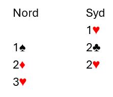 Syd bør melde 2 kløver i andre melderunde. Enkelte velger å si 2 hjerter, men syd har fine kort, og det kan godt være en glimrende kløverkontrakt i dette spillet.