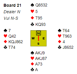 Hvis syd hadde visst at nords første pass var ment som positiv hånd burde han selvsagt gjort mer enn å løfte 3 spar til 4 spar. Det blir imidlertid mye enklere for dem om nord melder 3 spar med det samme over vests 3 ruter. Da bør de kunne finne frem til storeslem som i praksis er helt nedlegg.