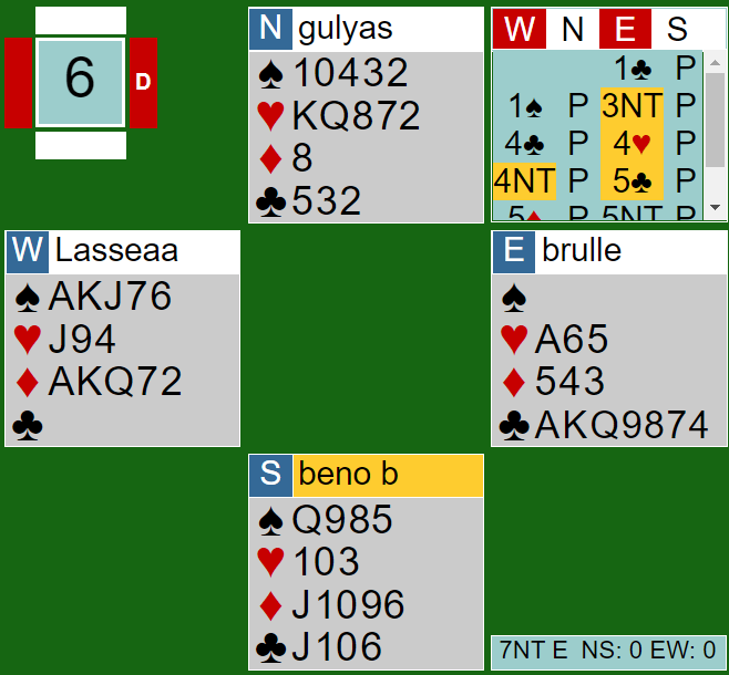 Da syd kontrollmeldte ruter gikk nord i 4NT - Key Card Blackwood, og syd viste to nøkkelkort (ruter ess og hjerter konge. Det eneste som fra nords synspunkt kunne vært et problem og ført til at slem ikke var god var hvis syd hadde tre små spar. Hvis er slem sannsynligvis avhengig av sparfinessen, men syd kan også noen ganger ha singel spar, eller spar konge.