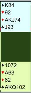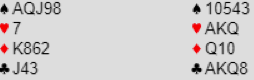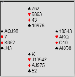 Som du ser er dette spillet slik, trumf konge og ett ess mangler. Så det er en ganske bra slem denne gangen siden sparfargen er så tett, normalt en ren 50% slem avhengig av spar konges plassering (minus kanskje at kløver kan sitte 6-0, eller ruter 6-1 slik at N/S kan få en stjeling).