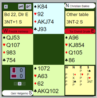 Ved begge bord kjørte spillefører i gang med kløveren etter underveis å ha tatt en kløverhonnør. Mot slutten tok Midt-Trøndelags syd ruterfinessen. Det førte til to bet da hele spillet så slik ut:
