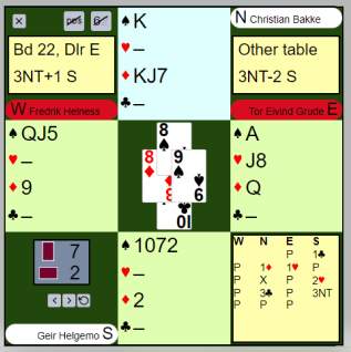 Helgemo var i 3NT. Øst hadde meldt inn 1 hjerter etter starten 1 kløver fra syd og svaret 1 ruter fra nord (Bakke). Ved det andre bordet gikk meldingene annerledes, og øst fikk ikke meldt inn på ett-trinnet. Likevel fant Charlsen (vest) beste utspill, liten hjerter. Det utspillet kom selvsagt også der øst hadde meldt hjerter.
