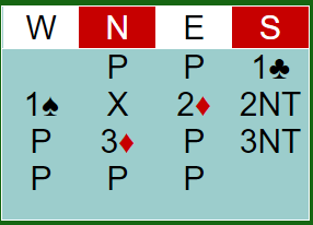 Nords dobling viser hjerter. Forklaringen på 2NT er at det ikke er naturlig, men den såkalte «Good-bad-2NT» hvor 2NT brukes som en melding med (normalt) kløverfarge, meldingen 3 kløver er en annen måte å melde kløver på. Dette er for å differensiere mellom sterke hender og en god, lang farge, og hender med lang farge men ikke så mange poeng, kort som man også ønsker å konkurrere med.