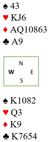 I dette spillet skal det spilles 3NT i lagkamp etter at vest åpnet med 1 spar (minst femkorts farge), nord meldte inn 2 ruter, syd inviterte med 2NT etter pass fra øst, og nord la på til 3NT.