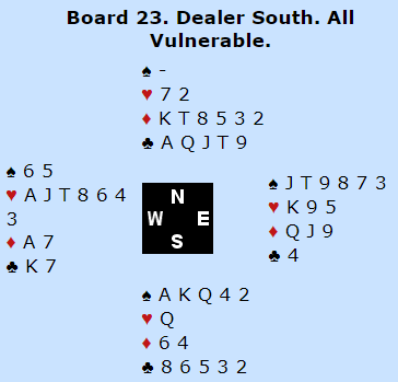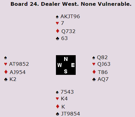 Mot meg som nord i NZ sin kamp fant de to ganger hjerter i starten, og kontrakten min var i fare. Men på ruter fra syd la vest liten, og da føk utgangen hjem likevel - uavgjort spill. Å legge liten ruter i den situasjonen er bare riktig motspill om nord faktisk har ett inntak til til syd (en hjerter til, eller en spar), og spillefører har K-J i ruter så han får et valg når vest legger liten.