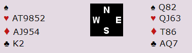 Normalt spilles på hjerterfinesse med slikt. Så syd må ha kongen i den fargen. Dessuten må syd ha minst en ruterhonnør. Slik så hele spillet ut: