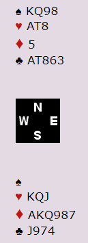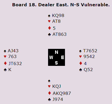Mens vi venter på å få vite hva som vil skje tar jeg med et interessant spill fra en av kvalifiseringskampene forrige uke. Jeg tar med hele spilldiagrammet, for det er nesten vanskelig å se selv med åpne kort hva som skal til for å bete den mest vanlige kontrakten med disse kortene: