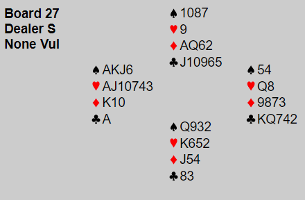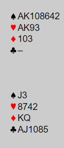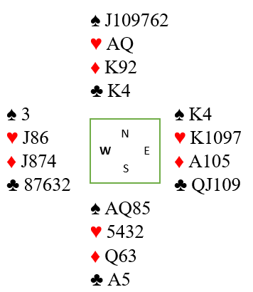 Nord åpner med 1 spar, og slik de som spiller med 2-over-1 som utgangskrav blir syd sitt svar 1NT. Uten spesielle avtaler blir det da litt gjettekonkurranse for nord. Hans hånd er ikke så sterk i form av HP, men med 7-4 fordeling og gode farger kan det stå slem om syd har de riktige kortene. For eks., la oss si syd har Q, eller QJ i hjerter i stedet for de fem poengene i kløver. Så det kan stå slem.