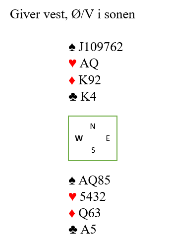 Vest høynet østs 1 spar til 2 spar, og det kan være en veldig svak løft for dem (og det kan en godt se…). Øst spurte med 2NT, og vest sa 3 spar som sa nettopp det, "jeg har en veldig svak løft". Øst melde utgangen.