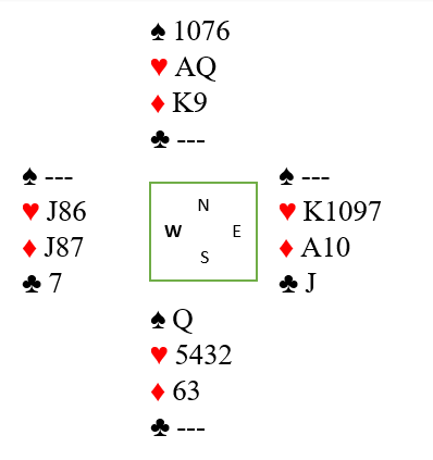 Syd spiller ut hjerter 3 til tieren, damen og esset. Det kan vel være en hjerterstjeling på gang her, så spillefører dengte ned A-K i spar. Det ble feil da det satt slik:
