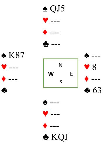 Vest har igjen ruter konge, men det kortet trumfes øst for å komme over til øst for å stjele nok en hjerter. Idet spillefører har trumfet to hjertere har vest kun igjen K-8-7 i spar, og disse kortene er igjen: