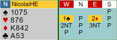 Meldingene var etter polsk kløver hvor 1 kløver kan være flere ting, 2 ruter var naturlig og positivt svar, og 2NT viste en 12-14 NT. Kløveråpneren behøver ikke ha kløverfarge, men det står vel likevel mellom majorfargene når utspill skal velges her. Nords eneste farge er ruter, men det kommer jo minst fem ruter opp i bordet. I valget mellom spar og hjerter valgte Nicolai den litt sterkere sparfargen, og da traff han Anders Brogeland hjemme!