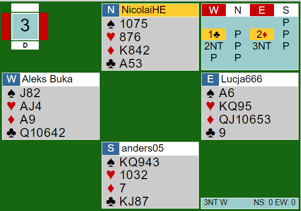Anders (syd) hadde nesten til innmelding, men det var på to-trinnet, og at han ikke meldte var helt greit spesielt siden makkeren var der for han og spilte ut spar! Hvis N/S melder kan det jo hende Ø/V ikke kommer i 3 grand også. Sparutspillet gikk til liten fra øst og damen, og liten spar tilbake godspilte tre stikk til i spar for syd. Spillefører hadde kun en reell sjanse, ruter konge dobbel i saks. Han tok ruterfinessen, men nord vant med kongen og spilte sin siste spar. Anders tok sparstikkene, og nord var raskt frempå med svakhetskast i hjerter. Derfor ble det enkelt for syd å spille kløver etter sparstikkene, og dermed fikk N/S tak i hele syv motspillstikk, +300.