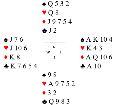 En kan bare tenke seg hvor ille de kunne gått med 2 hjerteråpneren om makkeren hadde hatt singelton hjerter og ikke mer enn tre kløver, samt lite honnørpoeng. Da ville makkerparet ha risikert å spille 2 hjerter på 5-1, eller en rusten kontrakt med 4-3 tilpasning i minorfarge på tretrinnet, doblet hvis motsanderne vet å straffe slikt. Men her gikk det nokså greit for N/S sålangt da Ø/V ikke hadde ressursene som skulle til for å kunne straffe N/S. Etter 2 hjerter gikk det to passer til øst som doblet, vest sa 3 kløver, og øst avsluttet med 3 grand.