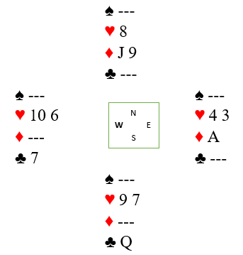 Syd valgte å spille ut spar 9. Det rullet opp sparfargen for spillefører (selv om han fortsatt ikke vet at det er 9-8 dobbel). Det gikk spar 9, knekt, dame og honnør. Så inn på bordet på ruter konge og hjerter knekt som nord dekket med damen, øst med kongen og syd vant med esset.