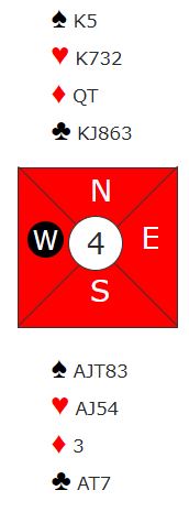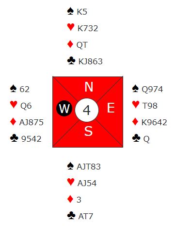 Syd åpnet med 1 ruter. Vest gikk innpå med 1 hjerter, og nord doblet for å vise firekorts spar. Øst passet, og syd meldte 4 spar før det gikk pass rundt.