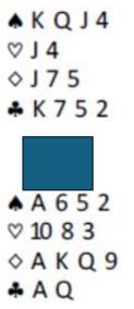 Det er klart at 5-0 i trumf er veldig usannsynlig, det er faktisk kun i 4% av tilfellene det sitter så skjevt. I dette tilfellet må det dessuten være øst som har alle de fem uteværende trumfene for at det skal gå galt å stjele høyt. Det er dog sannsynlig at øst har trumflengde siden vest har all hjerteren, men likevel. På den annen side tapes kun ett overstikk om trumfen sitter 3-2, for med 4-1 må det tapes ett trumfstikk. Om det spilles parturnering er det vel mer tvilsomt om det bør spilles så safe i en helt normal kontrakt?