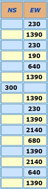 En score var "umulig", +300 til N/S kom pga. en misforståelse som førte til at Ø/V spilte 4 hjerter på 3-2 tilpasning og gikk tre bet. Ellers var alle scorene på Ø/V: fire delkontrakter, tre utganger, seks lilleslemmer, og to par var i storeslem i ruter som var ganske enkel å vinne slik det satt.