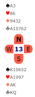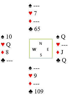 Etter å ha eliminert spar og ruter og innkassert de to hjerterhonnørene ser det slik ut: