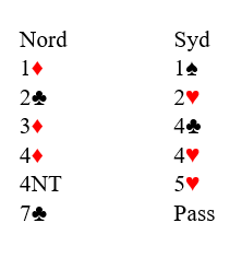 Over syd sin 2 hjerter – fjerde farge krav – viste nord ekstra lengde i ruter, og syd støttet kløveren. To kontrollmeldinger fulgte, og Fredrik gikk på med Key Card Blackwood. Da alle nøkkelkortene og trumf dame var bekreftet på plass, og Fredrik ikke helt kunne seg for seg kort syd kunne ha hvor det ikke var gode sjanser i 7 kløver, meldte han det. Nord har grunn til å forvente en majorkonge hos syd etter disse meldingene, og hjerter konge dekker opp den fargen, spar konge gir avkast for nords lille hjerter. Skulle syd mot formodning ikke ha det kan det sett fra nords synspunkt fortsatt være muligheter hvis syd har ruter dame, slik at den fargen kan gi avkast for syds hjertere. Det må være spill for 7 kløver, og det var en fin kontrakt.