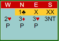 Det startet med tre naturlige meldinger, så 2 hjerter som fjerde farge krav. Det er en glimrende konvensjon som ikke viser lengde i fjerde farge, men bare etablerer en kravsituasjon som gjør det komfortabelt å finne riktig utgang, eller noen ganger bruke konvensjonen for å invitere til slem i en kravsituasjon.