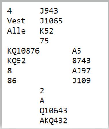 Selv om øst ikke skifter til ruter etter det fjerde sparstikket får han en sjanse til idet han er inne på kløver ess. Likevel føk 1NT hjem med syv stikk ved seks av de 14 bordene. Kun to Ø/V-par, inkludert mitt gikk en bet, -100. Det ga likevel ca. 30% da noen få Ø/V-par hadde vunnet delkontrakter i spar og hjerter.