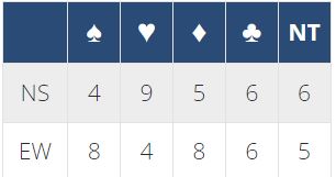 Dette er hva som teoretisk sett kan oppnås, antall stikk hvis det spilles med åpne kort av både spillefører og motspillere. Her bekreftes at det er mulig å vinne ni stikk i hjerterkontrakt N/S. Analysen er med åpne kort, men i dette tilfellet er det ni stikk i hjerterkontrakt i praksis også. Det ikke så vanskelig å få det om de får spille kontrakten, dog heldig, for øst har begge ruterhonnørene så damen tynt tredje hos syd blir stikk.