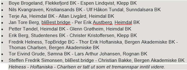 Her er det noe (litt) nytt, og endel "gammelt". Noen av parene har spilt sammen i en årrekke, men det er også noen par som har vært på landslaget de siste årene som nå har slutte å spille sammen. Dermed er det noen nye kombinasjoner også. Ikke helt ideelt, for etablerte, langvarige makkerpar med internasjonal erfaring er trolig det som skal til for å lykkes internasjonalt. Men de nye parene er spennende. Normalt antas at nye makkerpar behøver 3-5 år for å etablere seg og bli stabile nok, men det kan kanskje ta kortere tid om de to spillerne på en måte kommer fra samme "bridgekultur", og det gjør egentlig de fleste norske toppspillere.