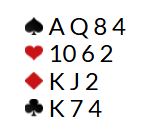 Her er et typisk parturneringsspill fra SILODOR PAIRS i St Louis, en turnering som tidligere nevnt ble vunnet av Nicolai Heiberg-Evenstad sammen med svenske Alexander Sandin. Seieren ble fulgt godt opp av Martin Andresen og Thor Erik Hoftaniska som ble nr. 2!