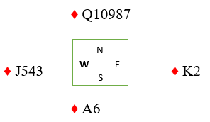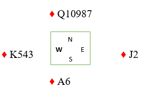 Det er med 4-2 sits det er litt forskjellig prosentsjanse. Hvis en av motstanderne har KJ-fjerde er det likegyldig hva du gjør, han har to stoppere med riktig motspill. Hvis en av dem har K-J dobbel er det også samme hvilken fargebehandling du velger, da blir det fire stikk. Det som gjenstår er kongen dobbel, eller knekten dobbel på en av sidene. Hvis esset spilles fulgt av liten mot nord og vest kommer på med kongen dobbel har øst med knekten fjerde forsvarets andre stopper. Sitter det slik blir det to tapere i fargen også om den andre måten å spille fargen på (damen fra nord). Men hvis esset spilles først fulgt av ruter mot nord og vest følger med et lite kort bør damen spilles fra nord. Hvorfor?