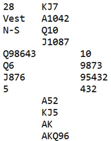 Det er også et scenario at vest passer. Da bør det enkelt ende i slem, enten ved at nord åpner, eller om nord passer får syd vist knallsterk hånd med 2 kløveråpning.
