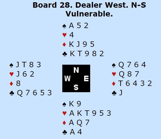 Dette er en knallhard slem hvor de mangler ett nøkkelkort og trumf dame. For det første må kløver konge må sitte i saksen. Dessuten må hjerteren spilles riktig. Det er et ekkelt valg, for om fargen sitter 2-1 er det hipp som happ om det skal spilles knekten la løpe (riktig med damen foran), eller liten til kongen (riktig hvis esset dobbel sitter foran og damen singel bak). Det valget blir 50/50 om fargen sitter 2-1, og spilles liten til kongen (lavt fra syd) blir det to trumftapere, Men det er beste sjanse å ta finessen fordi det får med seg den ene ekstra sjansen at alle de uteværende tre hjerterne sitter foran. Polen noterte seg for +980 som eneste par av de fire parene i seminfinalen, og Norge tapte 11 IMP.