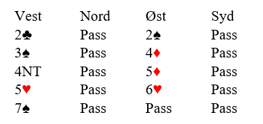 Vest kunne (burde?) nok ha avsluttet med 7NT som kan være litt bedre enn 7 spar. Spar eller hjerter kan sitte grusomt skjevt, og gjør det det kan 7 NT likevel stå, for eksempel ved hjelp av en kløverfinesse om det er nødvendig om en av majorfargene gir kun fire stikk. Det kan i teorien også komme hjerter ut til stjeling (5-0) mot 7 spar, mens 7NT har sjanser likevel. Men for all del, å finne frem til storslem er bra, og her var det tretten enkle stikk.