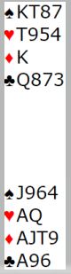 Slik det sitter må det nesten bli ni stikk i NT. Det kom ruter ut. Det er naturlig å gå på sparen for å godspille to stikk i den fargen. Ruteren ordner seg av seg selv, hjerter konge sitter i saks, og det blir ni stikk, noe Aaseng innkasserte ganske raskt.