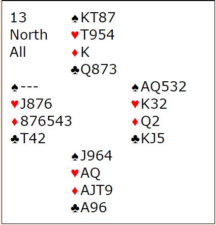 Hvorfor de havnet i NT i stedet for sparkontrakt vites ikke sikkert, et forsøk på kontakt med en av spillerne på vinnerlaget like etter spillingen var ferdig var ganske resultatløst. Men kvalifisert gjetting tilsier vel at øst hadde åpnet med 1 spar etter deres system, selv om det for mange ville vært 1NT-åpning. Så lenge øst har vist femkorts spar er ikke sparkontrakt andre veien aktuelt lenger, og de heiste seg opp i den hardmeldte, men sjanserike utgangen 3NT.