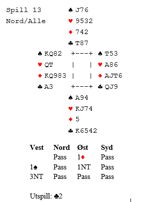 Etter å ha vist begge major med en ganske sprek innmelding 2 kløver (dog i gunstig sone), spilte Helgemo ut ruter dame. Den fikk beholde første stikk. I andre stikk gikk det liten ruter til esset og nok en ruter. Spillefører angrep kløveren. Nå var det fare for å dytte på kontrakten. Sett at stor kløv fra spillefører blir stukket av syd (Helness). De kan ta ett stikk i ruter og har fire motspillstikk. Så spiller de vel hjerter (spiller ingen rolle), og dette er igjen (om syd stakk før det siste kløverstikket spilles: