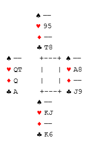 Dette kan bli sluttposisjonen både i 3NT og 6 ruter (NT) hvis det ikke kommer kløver ut og kløver en gang til idet syd er inne. La oss for eksempel si det kommer trumf ut mot 6 ruter. Idet kløver dame på et tidspunkt spilles kan ikke syd dekke med kongen, for gjør han det kan en finesse tas med nieren som gir det tolvte stikket. Så sluttposisjonen kan bli slik som i vårt diagram.